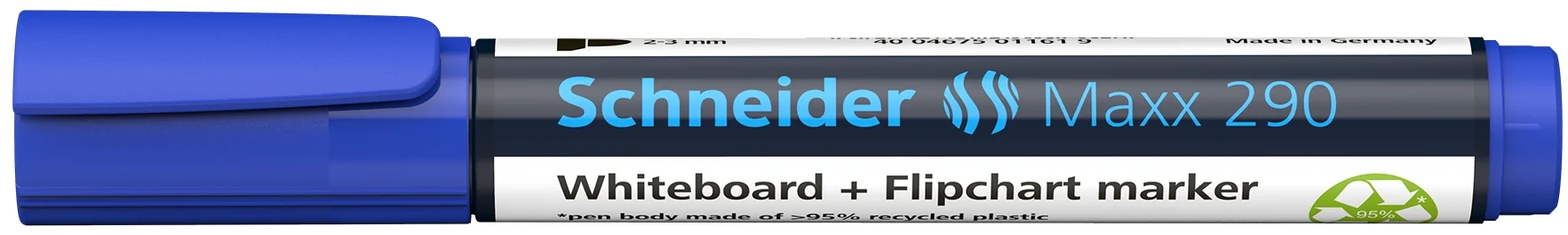 Whiteboard and flipchart marker with bullet tip, line width 2-3 mm. Writing colour blue. *Housing consists of 95% recycled plastic. Whether on a whiteboard or on paper, the strong, vibrant colours are easy to read even from the back of the room. The ink can be removed from whiteboards with a dry cloth without leaving residue and will not seep through to the page underneath on flipcharts. The cap-off ink does not run dry even if the cap is removed for 2-3 days. It has a low odour and is free of toluol and xylol. The new higher volume format contains more ink for maximum writing performance and the new bullet tip writes pleasantly soft without squeaking noises. The Maxx 290 has a practical clip cap and can be refilled using Maxx 665 refill station .